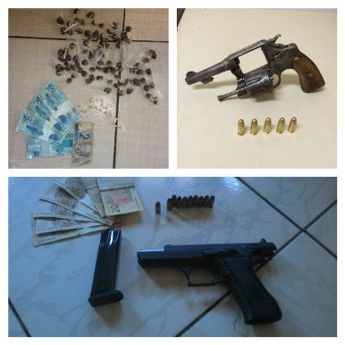 Ainda em Novo Horizonte, os militares avistaram dois suspeitos no interior de um coletivo da linha 846 e após realizarem a abordagem, perceberam que um dos deles havia colocado algo embaixo do banco. Foi encontrado um revólver calibre 32 e uma bucha de maconha. Já detidos, B.B., e H.J.S., informaram aos militares que compraram a arma por R$ 500,00 para se defenderem de gangues rivais de Feu Rosa.