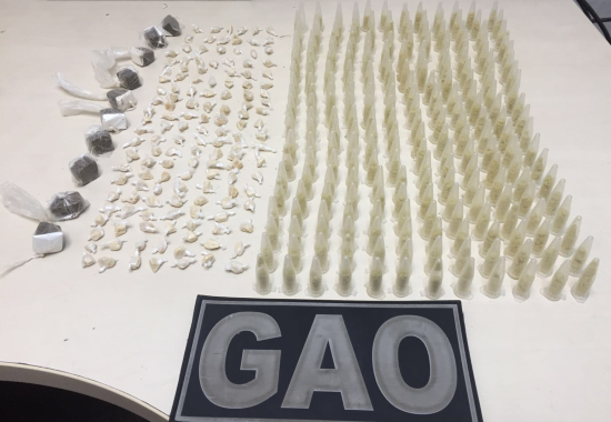 Nesta quinta-feira (10), militares do Grupo de Apoio Operacional da 11º Companhia Independente prenderam suspeito de tráfico de drogas, e grande quantidade de drogas, sendo 239 (duzentos e trinta e nove) pinos de cocaína, 140 (cento e quarenta) pedras de crack e 10 (dez) buchas de maconha.