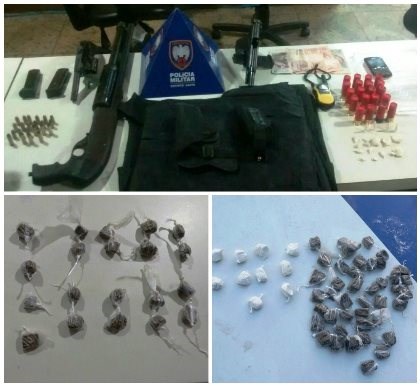 No Morro do Romão, os policiais abordaram J.F.S.M., de 21 anos, no Beco 8. Com ele foram apreendidos quatro pinos de cocaína, quatro papelotes de cocaína, 10 pedras de crack e a quantia de R$ 50,00 em espécie. O detido informou aos policiais que estava comercializando os entorpecentes. Devido a várias denúncias de que ele escondia armamento em sua residência, J., levou os policiais até a sua residência, onde foram apreendidos um colete balístico, uma espingarda calibre 12, um revólver calibre 38, uma pistola de calibre 9mm, dois carregadores para a pistola 9mm, um carregador de pistola .40, 20 munições de calibre 12, sete munições de calibre 38, 15 munições de calibre 9mm, um rádio comunicador e dois coldres.