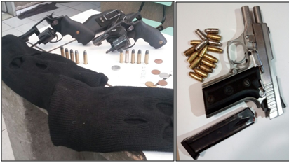 Durante as buscas foram apreendidas três armas de fogo, sendo uma pistola calibre 380, com 16 munições, um revólver calibre 38, com cinco munições, e um revólver calibre 38, também com cinco munições, além de duas balaclavas.