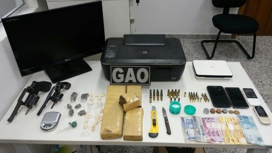Na residência foram apreendidos quatro gaiolas contendo quatro aves da espécie coleiro, duas armas de fogo, sendo um revólver 32 e um calibre 38, R$ 242,75 em espécie, aproximadamente 1,860 kg de maconha, sete buchas da mesma substância, 14 papelotes de cocaína, uma impressora, um aparelho dvd, um monitor, 51 munições, um alçapão usado para a captura de aves silvestres, um frasco de ácido bórico, uma balança de precisão, uma faca e um estilete utilizados para o preparo dos entorpecentes.