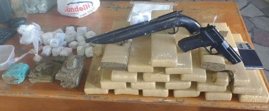 Durante o patrulhamento a equipe abordou o jovem D.M.S., 19 anos, e encontrou em sua posse um tablete de maconha. O criminoso contou aos policiais que havia adquirido o entorpecente com dois traficantes do bairro Cohab. Diante das informações, as equipes prosseguiram ao local indicado e abordaram a residência utilizada como ponto de venda de drogas. No lugar foram detidos mais quatro homens. Durante as buscas foram apreendidos mais 23 kg de maconha; 1,15 kg de crack; um simulacro de pistola; uma arma de fabricação caseira; uma balança comercial e uma balança de precisão.