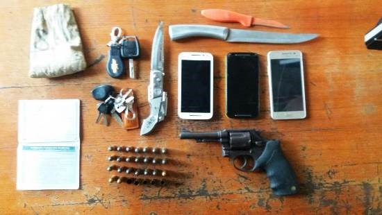 Por volta das 14h 20min, os militares foram informados que ocupantes de dois veículos teriam efetuado disparos de arma de fogo na Rua Onze e na Rua Vinte e Um Sul, em Guriri. Durante as buscas, as equipes abordaram um veículo Pajero com quatro ocupantes, entre elas uma criança de colo. Após a revista os policiais encontraram um revólver calibre .38 municiado com seis munições, além de 17 munições .38 intactas, três cápsulas .32 deflagradas, uma cápsula .38 deflagrada, uma cápsula .40 deflagrada, duas facas e um canivete. F.H.V., 25 anos, assumiu a propriedade do material e foi detido.