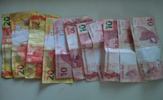 No veículo foi encontrada a quantia de R$ 100,00, sendo duas notas de R$ 20,00 e seis notas de R$ 10,00. Todas aparentemente falsas.