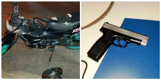 Durante a busca pessoal foi encontrado um simulacro de pistola com um dos suspeitos. A equipe realizou contato com o operador do Centro Integrado Operacional de Defesa Social (Ciodes), que informou sobre um ciclimotor com as mesmas caraterísticas que havia sido roubado nas proximidades. Os criminosos confirmaram o roubo aos policiais.