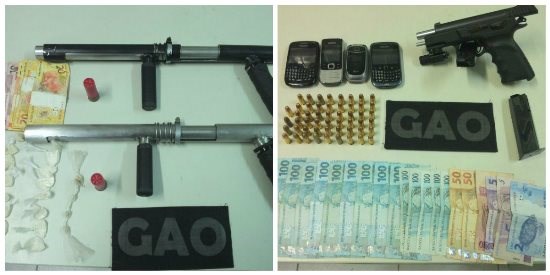 Os policiais prenderam quatro pessoas, sendo três menores e um adulto além de apreenderem 15 papelotes de cocaína, cinco pedras de crack, R$ 115,00 em espécie e duas espingardas calibre 12 de fabricação caseira.