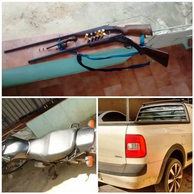 Durante as buscas foram apreendidos três armas de fogo, sendo um revólver calibre 32 e duas espingardas, diversas munições, um veículo VW/Saveiro Cross, uma motocicleta, cheques, nota promissória e outros materiais.